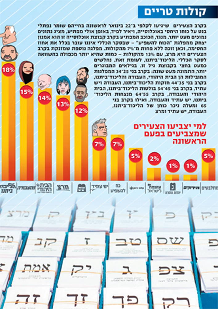 בקרב הצעירים שיגיעו לקלפי ב-22 בינואר לראשונה בחייהם שומר נפתלי בנט על כוחו היחסי באוכלוסייה, ויאיר לפיד מציג נתונים נמוכים ממנו. הכוכב המפתיע בקרב קבוצת המצביעים הזו הוא אמנון יצחק ממפלגת "כח להשפיע", שבסקר הכללי כלל אינו עובר את אחוז החסימה אך כאן זוכה ללא פחות מ-7% מהקולות. מפלגה נספת שמזנקת בקרב הצעירים היא מרצ, עם 13% מהקולות - יותר מכפול בהשוואה לסקר הכללי. הליכוד ביתנו לעומת זאת נחלש כמעט בחצי בקבוצת גיל זו.