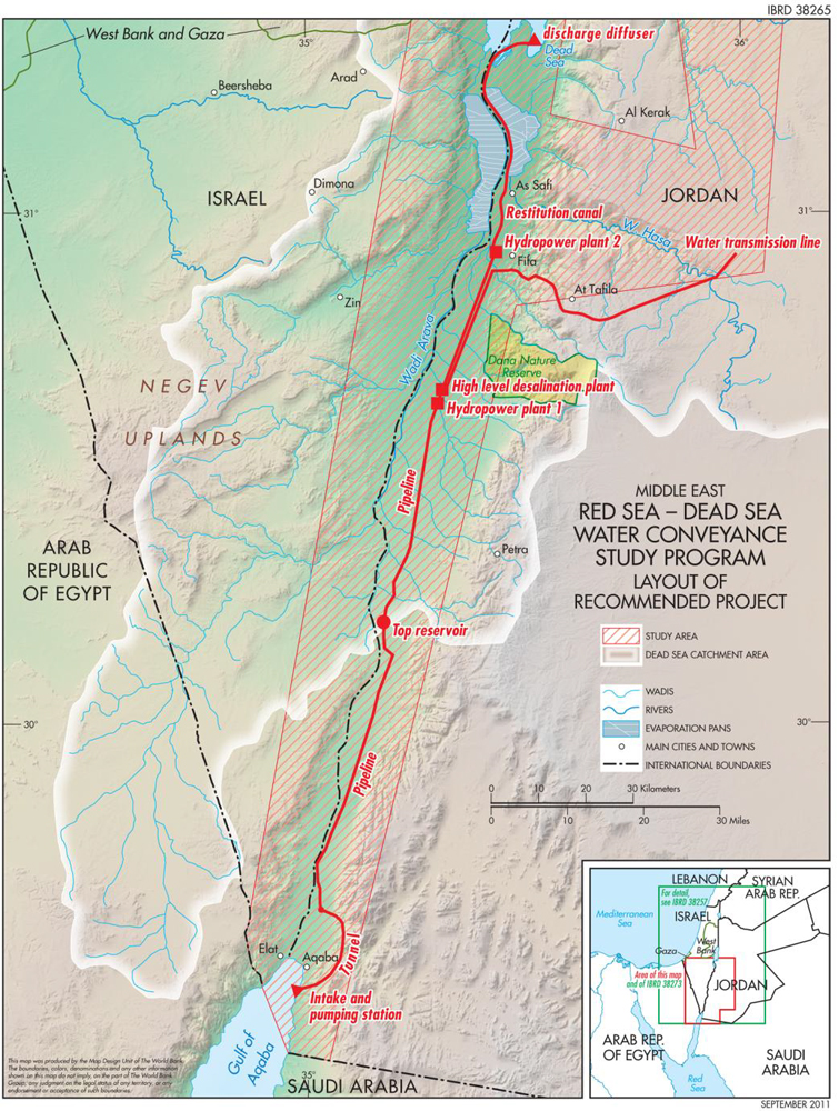 בתום 6 שנות בדיקה קובע הבנק העולמי כי ניתן לבצע את הפרויקט מבחינה מימונית וסביבתית. תחנת שאיבה מול חופי אילת ועקבה תשאב מים ותזרים אותם אל ים המלח הנעלם. בדרך המים יותפלו וינוצלו להשקיה ולשתיה, ואפילו יגיעו לעמאן. העלות: 12 מיליארד דולר. המכשול המרכזי: האביב הערבי