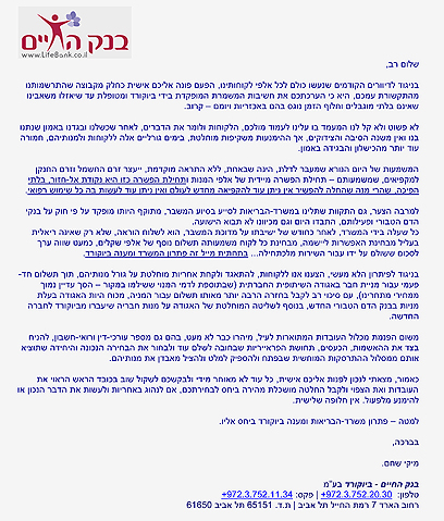 בעקבות הוראת משרד הבריאות לסגור את בנק הדם הטבורי "בנק החיים" שלח מנכ"ל החברה מכתב ללקוחות בו הוא מאיים להפסיק את זרם החשמל - ולהשמיד את המנות. "כולנו מוחזקים שבויים דרך מנות הדם של ילדינו", אומרים ההורים, שמתאגדים למנוע את פעולת ההשמדה