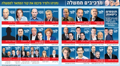 התמונה המסתמנת כעת היא שראש הממשלה בנימין נתניהו יחזיק בתיק החוץ, שיישמר לאביגדור ליברמן. גם שר הביטחון צפוי להיות מהליכוד-ביתנו - משה (בוגי) יעלון. שרת הקליטה תהיה ככל הנראה סופה לנדבר ושר התחבורה יישאר ישראל כץ. פאינה קירשנבאום מישראל ביתנו עשויה להתמנות לראשונה לשרה ותכהן במשרד החקלאות. הממשלה תכלול בסך הכול בין 21 ל-25 שרים - ההרכב המדויק עדיין בדיונים - ועוד כ-8 סגני שרים.