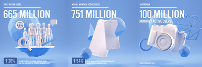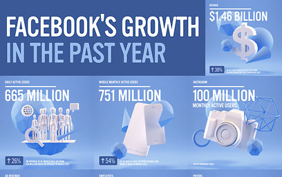 עוד מספרים: פייסבוק מפרסמת כי מספר המשתמשים החודשיים הפעילים עלה בכ-23 אחוזים מ-901 מיליון משתמשים חודשיים פעילים ל-1.11 מיליארד משתמשים , מספר המשתמשים היומיים הפעילים בפייסבוק עלה בכ26 אחוזים מ-526 מיליון ל-665 מיליון. מספר המשתמשים הפעילים החודשיים במובייל (סמארטפונים או טאבלטים) עלה בכ-54 אחוזים מ-488 מיליון ל-751 מיליון משתמשים חודשיים. באינסטגרם, הרכש של פייסבוק, ישנם 100 מיליון משתמשים פעילים.