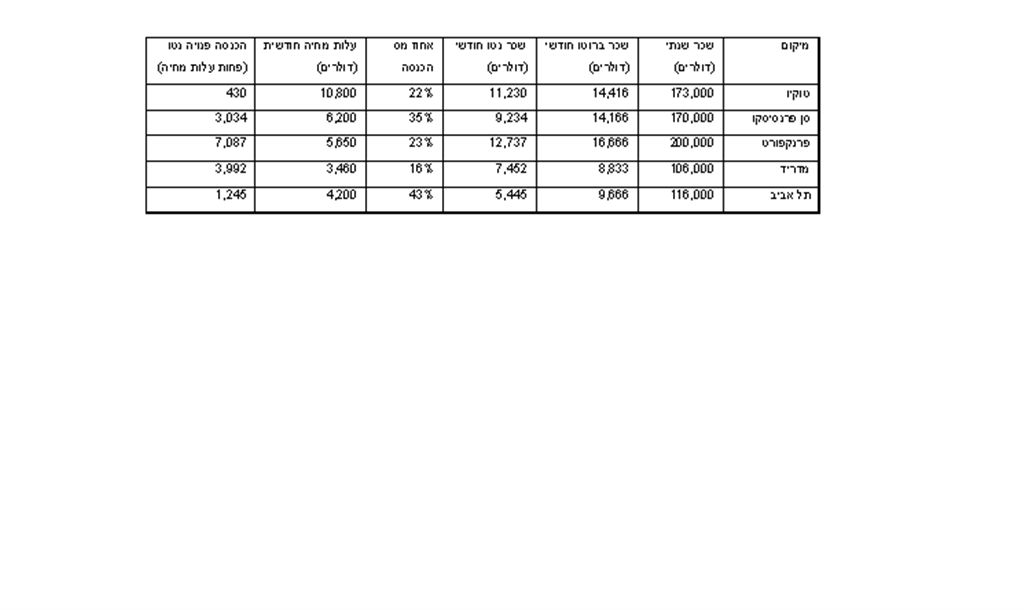 באילו מן הערים הכי משתלם לרואה חשבון לעבוד כמנהל כספים: תל אביב, סן פרנסיסקו, פרנקפורט, מדריד או טוקיו? השוואה בין הערים מגלה כי התשובה היא פרנקפורט שבגרמניה, שם השכר ההכנסה הפנויה שנותרת לעובדים במקצוע, כלומר הסכום נטו לאחר ניכויי מיסים ועלויות מחיה, עומדת על 7,087 דולר בחודש. בישראל לשם השוואה, מדובר על 116 אלף דולר בשנה ועל 1,245 דולר הכנסה פנויה בחודש בהתאמה.