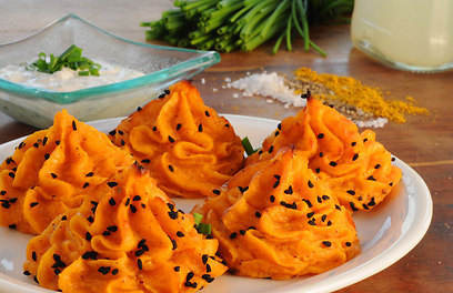 - בטטות אפויות עם זרעי כוסברה, זרעי חרדל ושומשום