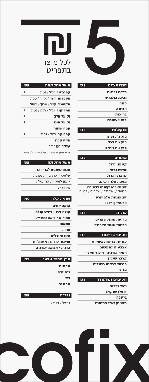 כל התפריט ב-5 שקלים – זה הקונספט של רשת הקפה החדשה קופיקס (cofix). היום (ב') נפתח הסניף הראשון שלה ברחוב אבן גבירול 92 בת"א. בחודש הקרוב ייפתחו שני סניפים נוספים בקינג ג'ורג' וברחוב הארבעה בת"א ובתוכנית: פתיחת 300 סניפים ב-3 שנים, שיופעלו בזכיינות. גובה ההשקעה בסניף: 300-200 אלף שקל. עלות המהלך: 5 מיליון שקל.