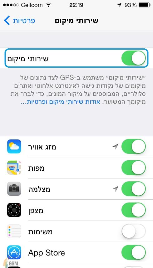מיקום: הגדרות>פרטיות>שירותי מיקום