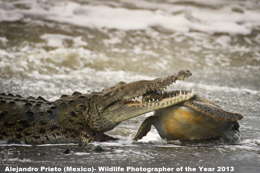 בציון לשבח בקטגוריית התנהגות זוחלים זכה הצלם Alejandro Prieto ממקסיקו. הצלם שהגיע לתעד כרישים באזור קוסטה ריקה, נתקל בקרוקודיל עצום שנאבק כדי לפצח צב ים ירוק. הצב עדיין היה בחיים בזמן התיעוד, חבט בסנפיריו ומצמץ ללא הרף. הצלם הצליח לתעד את הציד המהיר, רגע לפני שהקרוקודיל צלל למים עם צב הים חסר המזל.