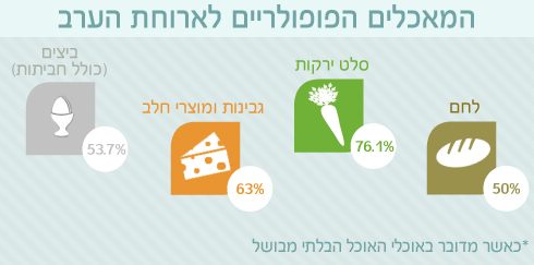 המאכלים הפופולריים ביותר אינם מפתיעים: סלט ירקות (76.1%), גבינות ומוצרי חלב (63%), ביצים כולל חביתות (53.7% ) ולחם (50%) כשמדובר באוכלי האוכל הבלתי מבושל.