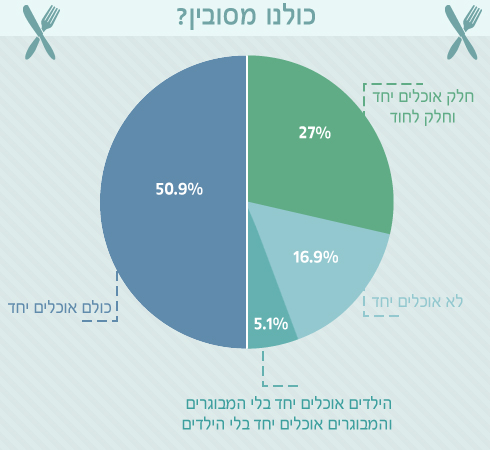 כמחצית (50.9%) מכלל המשפחות עם ילדים בישראל נוהגות לאכול ארוחות משפחתיות לפחות פעם אחת בשבוע בימות החול, ומי שלא מצליחים לעשות זאת חשים החמצה והיו רוצים לאכול יחד יותר פעמים במהלך השבוע. אגב, הארוחה המשפחתית המורחבת של שישי ושבת היא כמעט הרגל לאומי: 84.8% מקפידים כמעט תמיד על סעודות משפחתיות. בכמחצית מהמקרים (51%) מצטרפים לשולחן ילדים שאינם גרים בבית או חברים.
