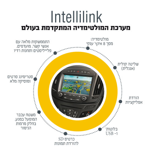 - IntelliLink – מערכת המולטימדיה המתקדמת בעולם, מסך מגע ענק, 8 אינץ', כוללת USB, כרטיס SD, בלוטות', משטח עכבר, הורדת אפליקציות ושליטה קולית (אנגלית).
