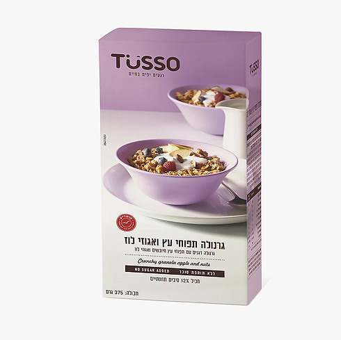 TUSSO מציעים טעם חדש לקטגורית המוצרים "ללא תוספת סוכר" ומשיק גרנולה ללא תוספת סוכר בתוספת תפוחי עץ ואגוזי לוז. מחיר מומלץ: 20 שקל ל-375 גרם.