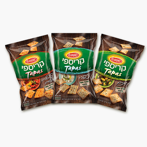 אסם מרחיבה את קטגוריית החטיפים האפויים ויוצאת בסדרה חדשה למותג קריספי: קריספי TAPAS - חטיפי קרקר אפויים במרקם פריך ודק, בתוספת פלפלים קלויים, בתוספת זיתים ובשילוב תוספות מעורב של שומשום, פרג ושום בצל. מחיר: 10.50-12.50 שקל.