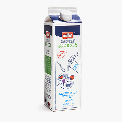 Muller משיקה יוגורט BIO לבן 1.7% שומן בלבד, 100% רכיבים טבעיים, בקרטון למזיגה נוחה ולשימוש חוזר. מחיר מומלץ: 14.30 שקל ל-1 ליטר.