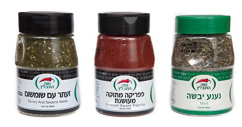 פפריקה מתוקה מעושנת – פפריקה מתוקה שעברה תהליך עישון. מעניקה טעם מעושן ארומתי. מתאימה לתיבול דגים, גבינות, עוף ועוד, נענע יבשה – 100% עלי נענע קצוצה יבשה. משמשת להכנת מגוון סוגי מנות – מרקים, תבשילים, ממולאים, קציצות, סלטים, להכנת מרינדות לעוף ועוד. מתאימה לחג השבועות להעשרת גבינות ולהכנת מנות חלביות וזעתר עם שומשום – תערובת של עלי זעתר, מלח, סומק ושומשום. תערובת מעולה לתיבול סלטים ולהכנת מטבלי גבינה. מתאימה במיוחד לתיבול לבנה עם שמן זית.