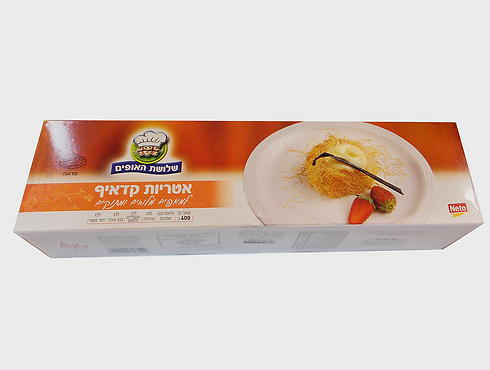 שלושת האופים מציגה מוצר חדש המיועד להכנת קינוחים - אטריות קדאיף: שערות בצק דקיקות ופריכות המשמשות כבסיס להכנת מגוון מתכונים מתוקים. מחיר: 18-20 שקל ליחידה במשקל 400 גרם. באריזה מגיעות 12 יחידות מופרדות.