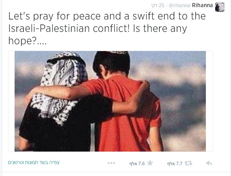 לאחר שאמש צייצה הזמרת בעד שחרור פלסטין והתחרטה, העלתה ריהאנה ציוץ חדש עם תמונה של ילד דתי מחובק עם ילד ערבי וכתבה: "בואו נתפלל לשלום". עכשיו הכל בסדר