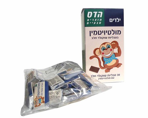- טבליות שוקולד חלב מועשרות במולטי וויטמין - המוצעות בפורמולה המותאמת לצורכי גופו של הילד, בתהליך הגדילה וההתפתחות. המארז מכיל 30 טבליות.