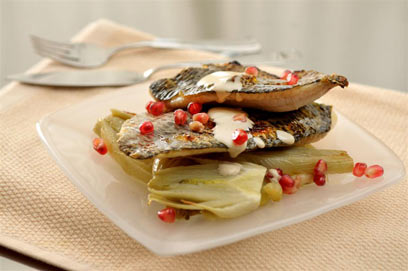 - מחלקים את השומר בין צלחות ההגשה, מניחים נתח דג על פני השומר ויוצקים מעליו את הטחינה.