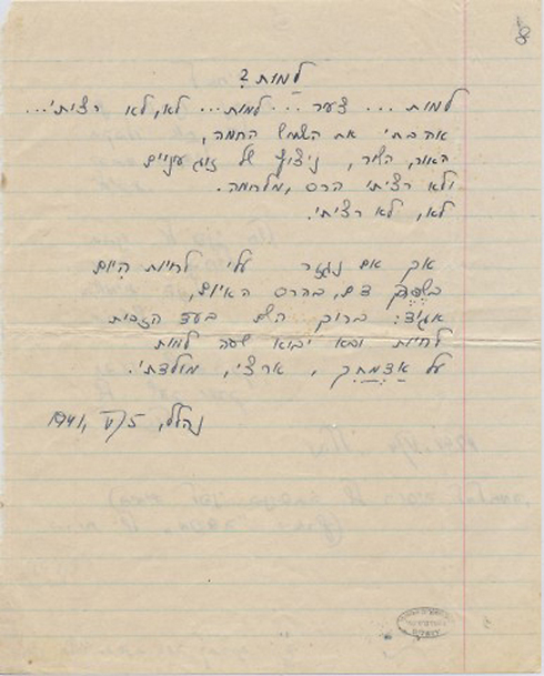 כתב היד המקורי של השיר "למות" מאת חנה סנש