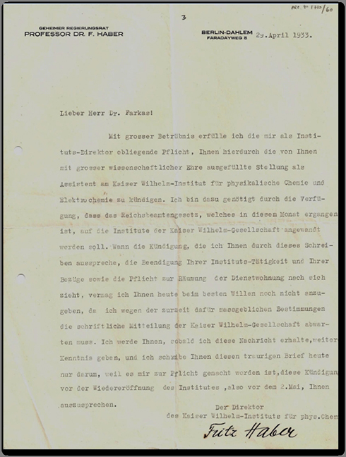 פרופ' פריץ הבר, כימאי גרמני שזכה בפרס נובל לכימיה, נולד כיהודי והתנצר על מנת להתקדם באקדמיה. הוא עסק בחקר גז האמוניה וזכה בנובל על תרומתו לתעשיית הדישון בחקלאות. הבר עסק בפיתוח חומרי הדברה כימיים נגד מזיקים בחקלאות ועמד בראש חברה גרמנית שפיתחה את גז הציקלון בי, החומר ששימש להרג היהודים בתאי הגזים. כפטריוט גרמני תרם במלחמת העולם הראשונה למאמץ המלחמתי הגרמני ופיתח את גז החרדל. ובכך הוא נחשב לאבי הלוחמה הכימית. ב-1933, כראש מכון מחקר, נאלץ לפטר את עוזרו היהודי ד"ר וריסלב פרקש יחד עם שאר העובדים היהודים. מכתב זה מפרט את חובתו אשר נכפתה עליו על ידי השלטון לעשות זאת.