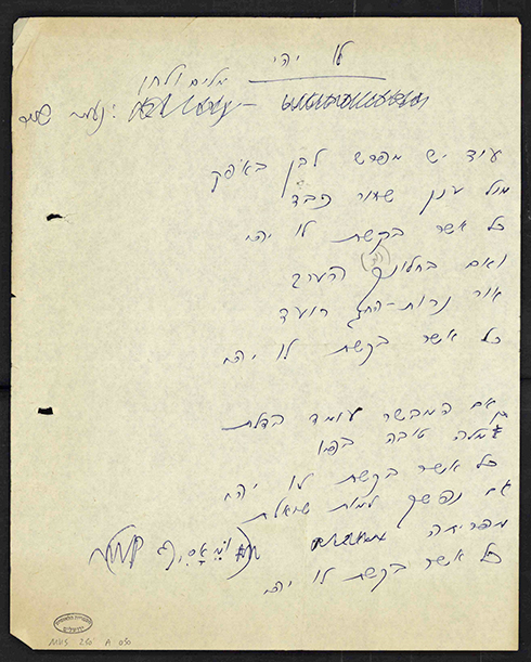כתב היד המקורי של "לו יהי" מאת נעמי שמר. בית אחד הושמט כדי לא לפגוע במוראל