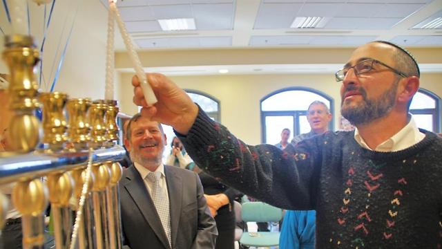 נחום למקוס, אביה של דליה למקוס ז"ל מדליק נרות בחנוכיה המיוחדת לצד אורי לופוליאנסקי