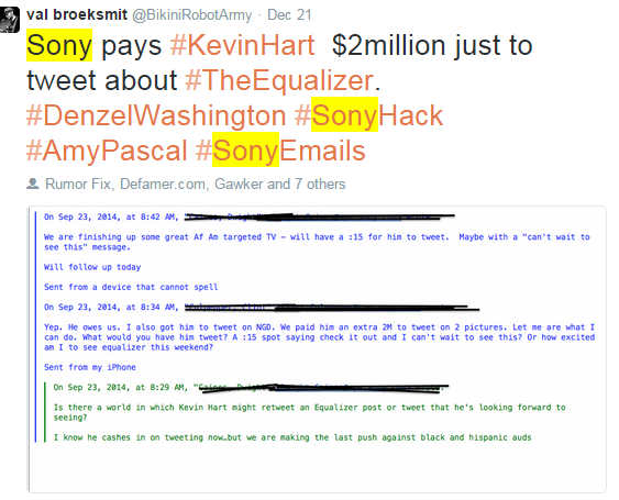 בין השאר הוא מציג מייל שאם הוא אמיתי, מראה שקווין הארט מקבל שכר של מיליונים עבור קידום סרטים בציוצים בטוויטר, ואכזבה של אשת יח"צ שעובדת עם סוני מהסרט "בין כוכבים" - מידע שחלקו שפורסם גם במקומות אחרים.