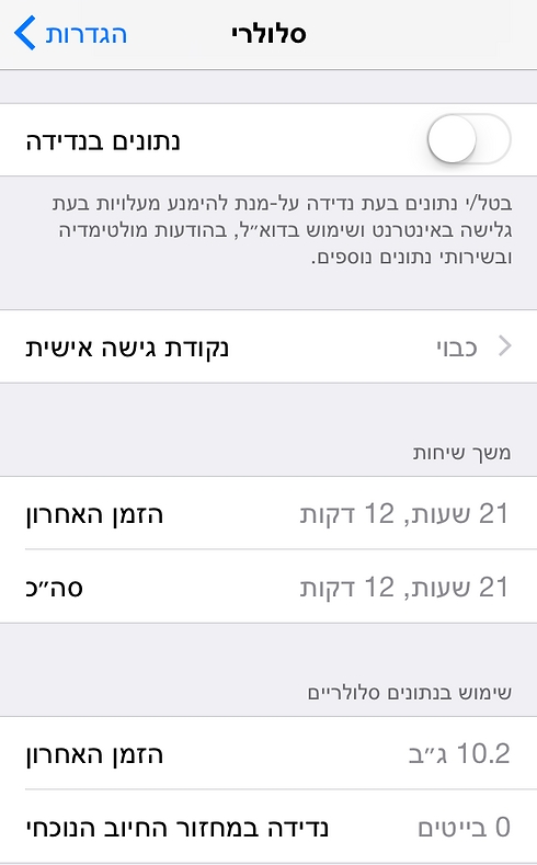 גשו להגדרות > סלולרי > רדו למטה שם תראו את נתוני השימוש בנתונים סלולריים. הנתונים האלה הם מהפעם האחרונה שאיפסתם או מהולדת הטלפון שלכם.