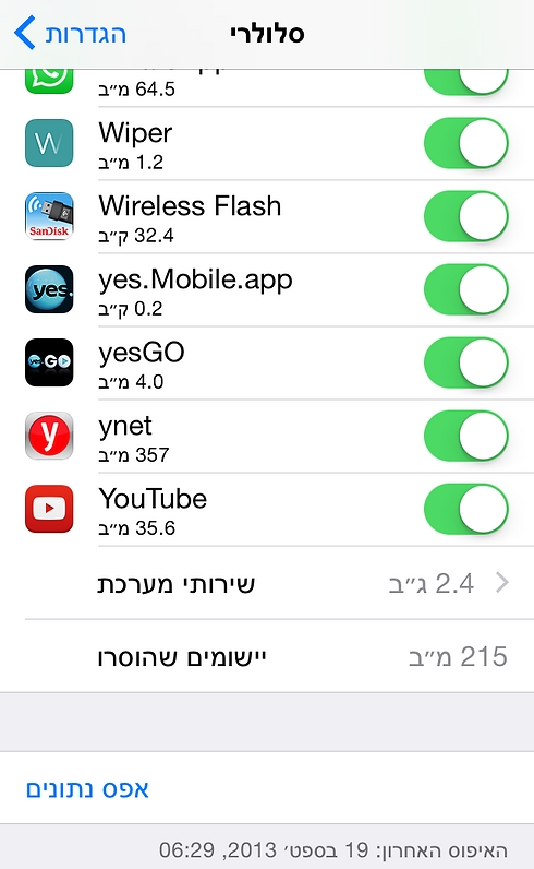 מולכם רשימת האפליקציות שלהן גישה לנתונים הסלולריים - שם תוכלו לראות כמה מחבילת הגלישה מנוצלת לאימייל, כמה לוויז ומפות וכמה לצפיה ביוטיוב. רדו למטה עד הסוף, מתחת לרשימה לחצו על אפס נתונים > אפס נתוני שימוש.