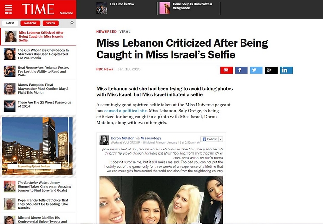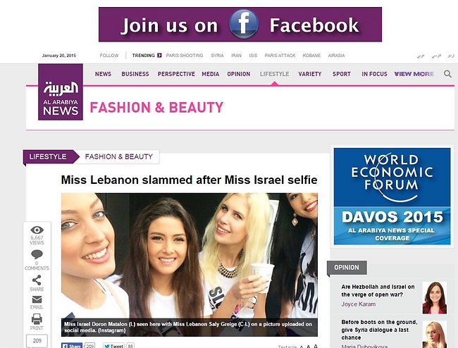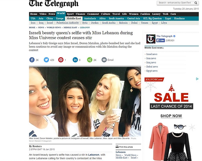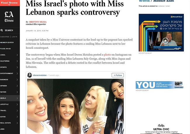 הסערה בעקבות הסלפי של דורון מטלון - נערת ישראל המייצגת אותנו בתחרות מיס יוניברס במיאמי - עם מיס לבנון מסרבת לגווע: בעקבות תמונה שהעלתה מטלון לחשבון האינסטגרם שלה ובה מופיעה גם המועמדת הלבנונית, סאלי ג'רייג', כועסים בעולם הערבי על המתמודדת הערבייה ובאים אליה בביקורת על ש"הסכימה" להצטלם עם מטלון הישראלית.