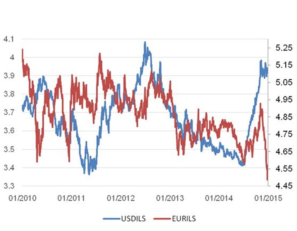 דולר-שקל לעומת אירו-שקל בחמש השנים האחרונות