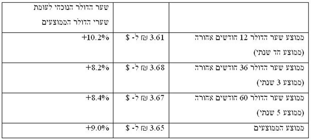ניתן לראות מן הטבלה שהיצואנים התרגלו לחיות לפי שער דולר ממוצע של 3.67 שקל בלבד בחמש השנים האחרונות. על ידי עסקאות גידור עתידי הם יכולים כעת להבטיח את מלוא שנת 2015 ואפילו מעבר לכך, לפי שער דולר הגבוה ב-8.4% ממה שהתרגלו לחיות איתו. זהו הפרש מדהים שקורה לעתים רחוקות ביותר.