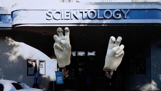כפות ידיים במחווה של "ציטוט" על רקע שלט של סנטולוגיה