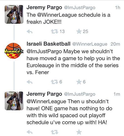 פארגו צייץ: "הלו"ז של מנהלת הליגה הוא בדיחה". במנהלת הליגה לא עברו בשתיקה והחזירו לפארגו בטוויטר: "אולי לא היינו צריכים להזיז את המשחק כדי לעזור לך ולקבוצה באמצע הסדרה מול פנרבחצ'ה". מי שחשב שזה ישכנע את פארגו להתנצל טעה. שימו לב לתשובה: "אז לא הייתם צריכים! משחק אחד לא קשור ללו"ז המשוגע שהמצאתם לפלייאוף. הא".