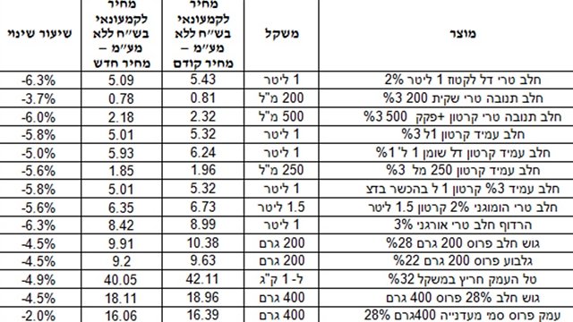 בין המוצרים שיוזלו: חלב טרי דל לקטוז 1 ליטר 2% - הוזלה של 6.3% למחיר של 5.09 שקלים, וקוטג' 3% 250 גרם - הוזלה של 4% - למחיר של 4.33 שקלים.