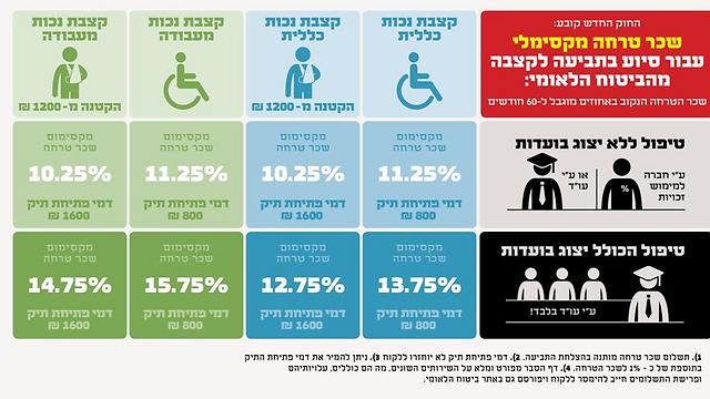 טיפול של עורך דין הכולל גם ייצוג בוועדה רפואית או עררים וגם ייצוג בבית דין לעבודה בתביעה לקצבה של עד 1,200 שקל יוגבל לשכר טרחה של 25.5% מקצבת הלקוח (או 23% ועוד 1,600 שקל), ובתביעה לסכומים גבוהים יותר יוגבל ל-24% אחוזים ועוד 800 שקל או 25.5%, לפי בחירת הלקוח. טיפול של עורך דין הכולל ייצוג בבית דין לעבודה בלבד יוגבל לשיעור של בין 11% בתוספת 1,600 שקל עד 13.5%, תלוי בגובה הקצבה שיקבל הלקוח.