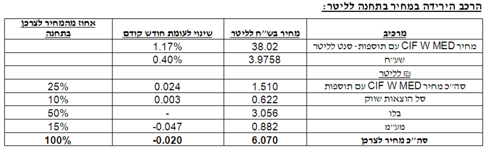 המחיר יעמוד על 6.07 שקלים לליטר, ירידה של 2 אגורות לעומת החודש הקודם. המחיר היה אמור להיות גבוה יותר עקב התייקרות הנפט בעולם, אך הורדת המע"מ ריסנה זאת. תוספת בעד שירות מלא תעמוד על 19 אגורות לליטר - ללא שינוי מחודש קודם