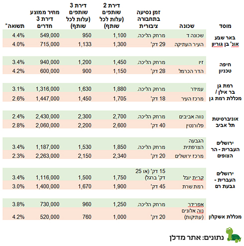 ניתוח מיוחד שביצע עבור ynet אתר מדלן, המספק לרוכשי הדירות מידע חיוני לפני רכישת דירה, בחן 7 מוסדות לימוד אקדמיים לפי פרמטרים של קרבה למוסד (שכונה), זמן נסיעה בתחבורה ציבורית, גובה שכר הדירה לדירות של 2 שותפים, גובה שכר הדירה לדירות של 3 שותפים, מחיר ממוצע לדירה עם 3 שותפים והתשואה מהשכרת דירה.