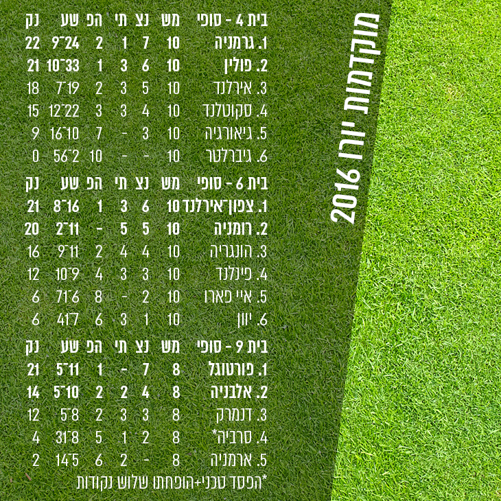 אלופת העולם גרמניה העפילה גם היא, עם 1:2 מכוער על גיאורגיה. פולין ניצחה את אירלנד בקרב הישיר על הכרטיס השני מהבית, וגם רומניה תשחק ביורו. הונגריה, שהפסידה ביוון, תעפיל הערב בתור הנבחרת הטובה ביותר מהמקום השלישי – אם אוקראינה לא תנצח את ספרד.