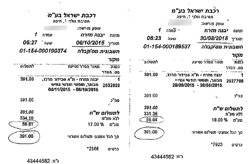 עוד נוסע קבוע של רכבת ישראל, הוא אלי שחרור הנוסע לעבודה בכל בוקר בשנים האחרונות מיבנה לתל אביב. שחרור שילם על כרטיס חופשי חודשי מיבנה לתל אביב 391 שקלים. אלי הופתע לגלות בחשבונית כי המחיר של הכרטיס לפני המע"מ עלה מ-331.38 שקלים ל-334.19 שקלים כשהמע"מ משלים את הסכום ל-391 שקל.