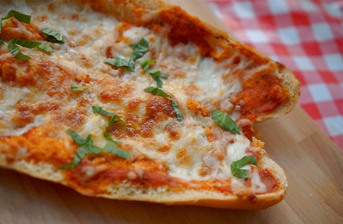 - מזלפים על הבגט הפתוח מעט שמן זית, מורחים רוטב עגבניות ומפזרים מעל גבינת מוצרלה.