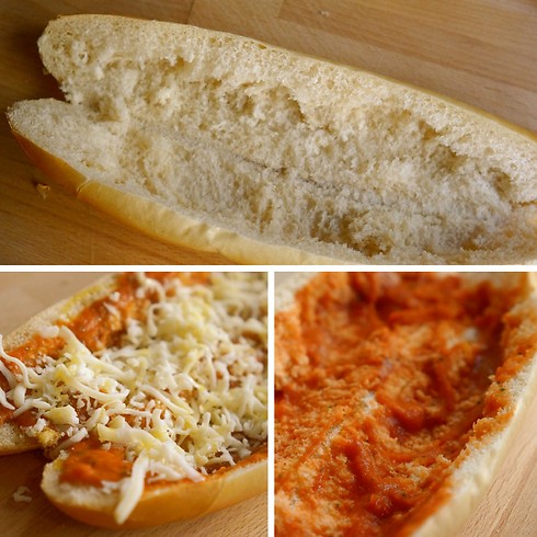 לחמנית באגט גדולה ורכה, חצויה לאורך ומוציאים מעט מהתוכן הרך שלה שיהיה מקום