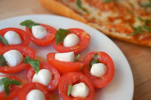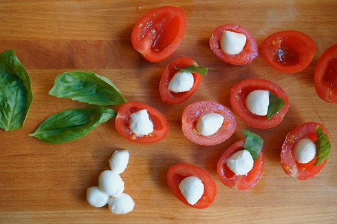 - מניחים כדור מוצרלה בגומת העגבניה ומעל פס בזיליקום.