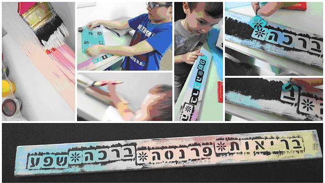 את מתנות ראש השנה שלנו החלטנו להכין השנה בעצמנו, כאמא לרון (7) וגיא (5) חשבתי שזו הזדמנות מעולה לקצת זמן איכות עם הבנים שבמשך כל השנה רואים אותי יוצרת במגוון תחומים והנה לכבוד החג נוכל להחליט יחד על מתנות לסבא וסבתא ומתנות לבני דודים שיגיעו לארוחת החג. ראשית החלטנו ליצור שלט לכניסת הבית, החלטנו ביחד על הגוונים הפסטלים שבטוח סבתא תאהב, בשילוב רצף מילים לאוירה חיובית ולברכה לבית.