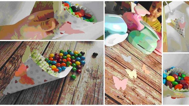 הקישוט הראשון שבחרנו לסוכה שלנו הוא "קונוס סוכריות" בעזרת גיליון קרדסטוק עם לבבות וקישוט הקונוס בפרפרים שנוצרו בעזרת פאנצ'ים (מחוררי צורות) של "ארט טו גו" שניתן להשיג היום, כמעט בכל חנויות היצירה. אפשר להוסיף את שמות האורחים על הקונוסים ולתלות בסוכה. למי שחושש שהסוכריות ישפכו, אפשר לארוז שקית צלופן קטנה, לקשור בסרט, להכניס לקונוס ולתלות כשרשרת קונוסים או לפזר כבודדים בסוכה.