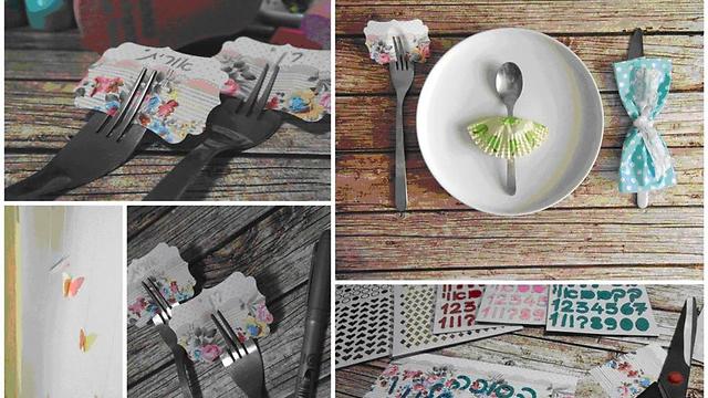 לכרטיסי סידור ישיבה השתמשנו בפאנץ' תווית פינות, את השמות ניתן לכתוב בטושים המעולים של bic בצבעי זהב או כסף. את התווית סידרנו על המזלג. עטפנו את הסכין במפית וקשרנו במרכז בסרט תחרה. ואילו הכפית שלנו, קיבלה "חצאית" מגביע נייר שמשמש בדר"כ לצורכי אפיה.