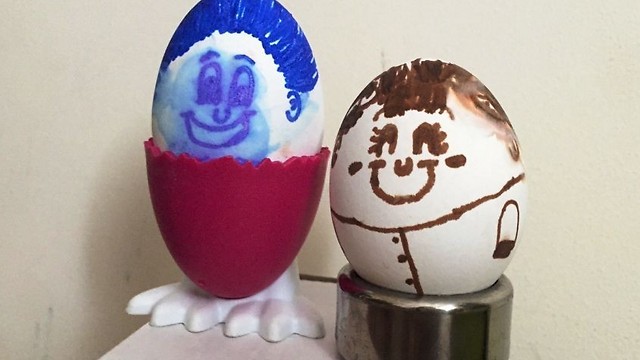 מכינים ביצים קשות ומחכים שיתקררו. לאחר מכן נותנים לילדים לקשט אותן עם טושים ומדבקות. אפשר לשים את הביצה בתוך גליל נייר טואלת ובכך ליצור חצאית ארוכה או מכנסיים.