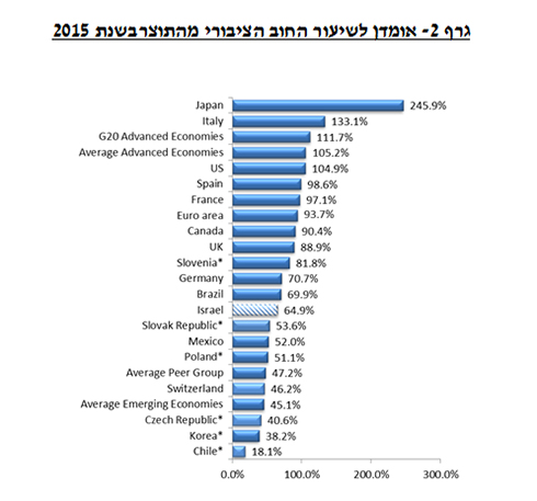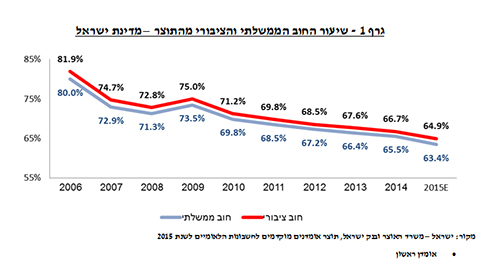 החוב של ישראל ל-2015 יורד משמעותית לשיעור של 64.9%, זאת לעומת 66.7% בשנה הקודמת - משקף ירידה של 1.8%. החשבת הכללית במשרד האוצר, מיכל עבאדי-בויאנג'ו, פרסמה היום אומדן ראשון לשיעור החוב הציבורי והממשלתי מהתוצר לשנת 2015. בהתאם לאומדן, שיעור החוב הציבורי מהתוצר, הכולל חובות של רשויות מקומיות, צפוי לרדת באופן משמעותי ולעמוד על 64.9%. יחס החוב מהתוצר מהווה את אחד האינדיקטורים המרכזיים המעידים על חוסנה הכלכלי של מדינת ישראל ומהווה שיקול מהותי בקביעת דירוג האשראי שלה.