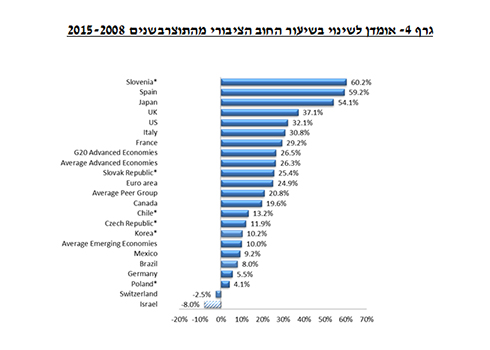 הגרפים שלהלן מציגים את שיעור החוב הממשלתי והציבור מהתוצר לאורך שנים והשוואות בינלאומית לשינוי ביחס החוב הציבורי לתוצר החל מפרוץ המשבר הכלכלי העולמי בשנת 2008. ניתן לראות כי ישראל בולטת לטובה בירידה המצטברת ביחס החוב לתוצר העומדת על 8.0%.