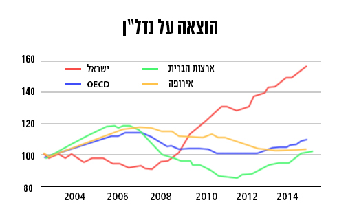 בגרף המשווה את מחירי הדיור, נראה שמחירי הדירות בארץ מופרזים לא רק בהשוואה למדינות ארגון ה-OECD, אלא מול ארה"ב וגוש האירו. המחירים נמדדים באינדקס של 100. כך, שבעוד שמחירי הדירות בישראל עומדים על 150, מחירי הדירות במדינות ה-OECD הם 110, בגוש האירו 105 ובארה"ב 102.