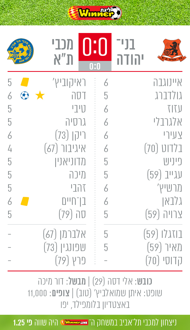 מכבי ת"א שוב לא הבריקה, אבל ניצחה 0:1 (אלי דסה) את בני־יהודה והעבירה את הלחץ להפועל באר־שבע